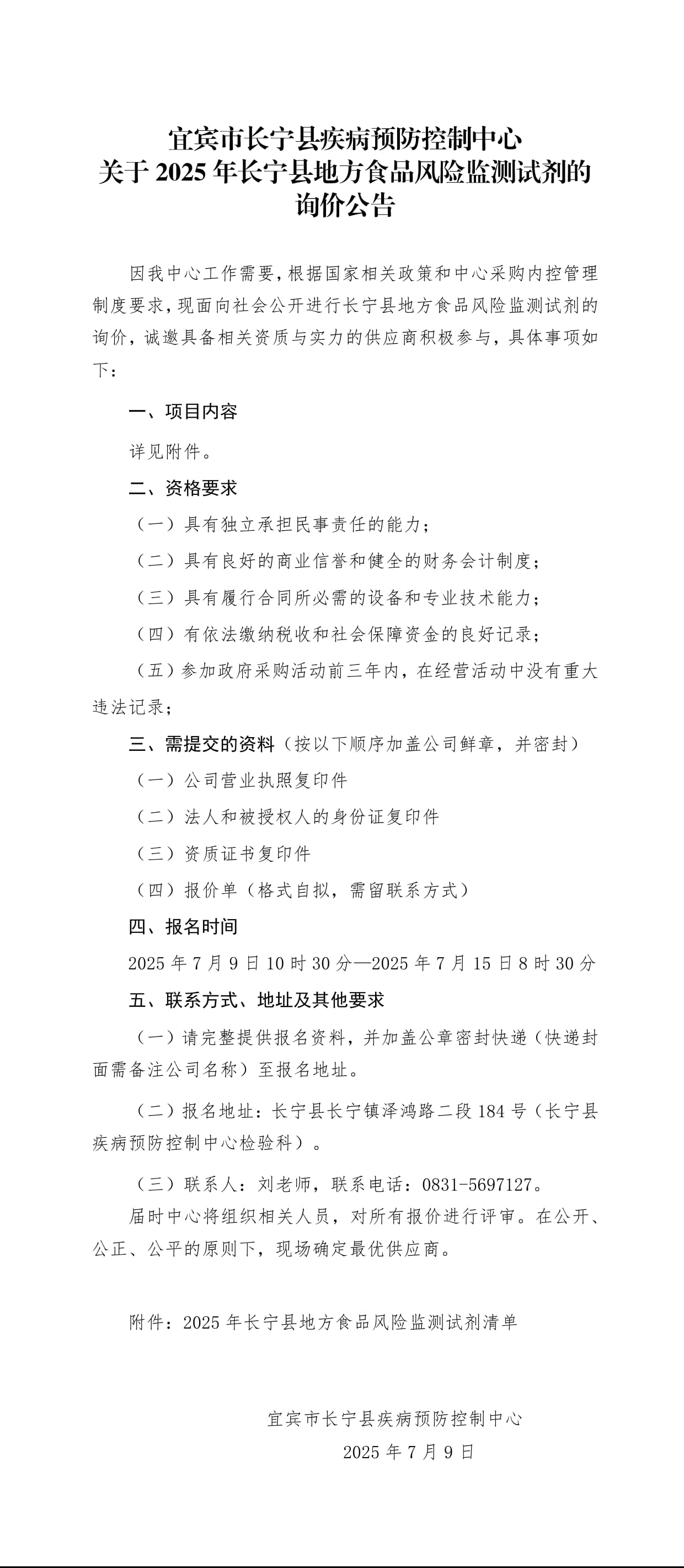 2025年长宁县地方食品风险监测试剂的询价公告