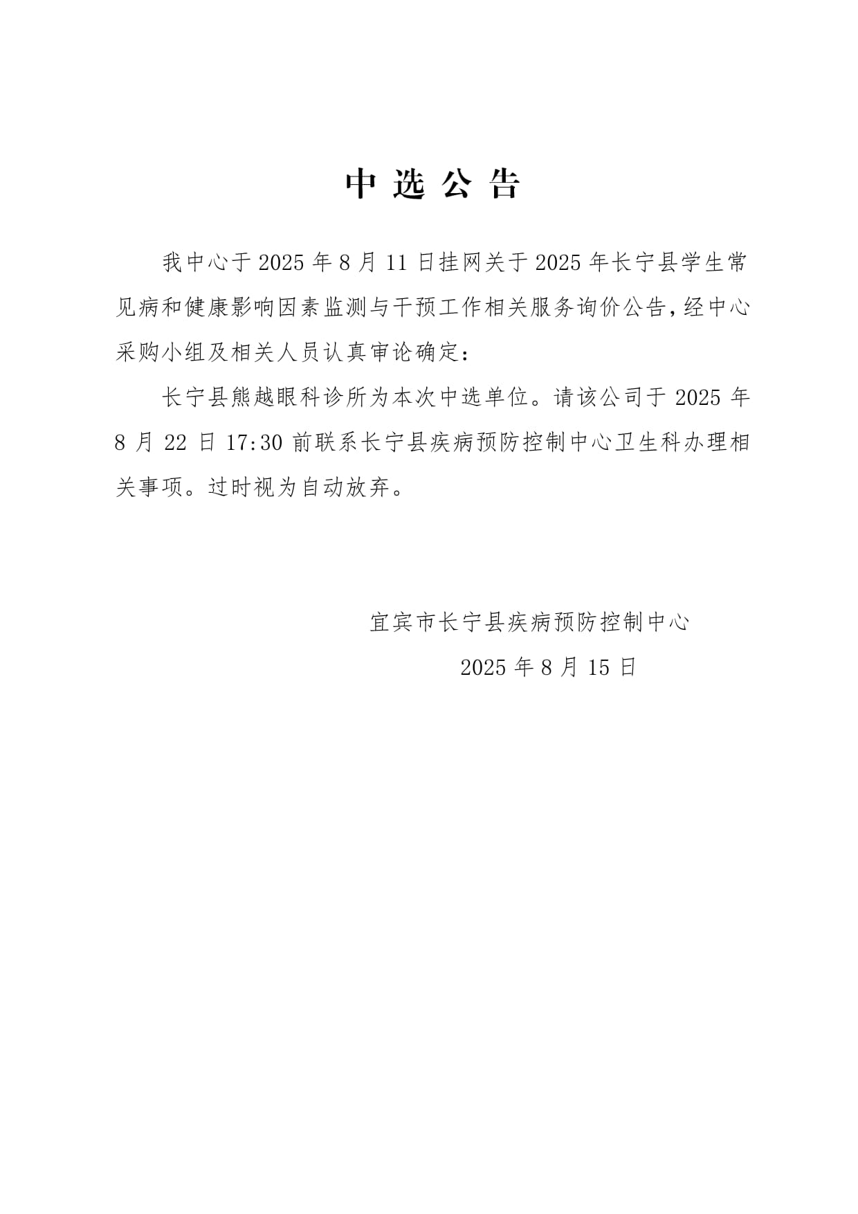 2025年长宁县学生常见病和健康影响因素监测与干预工作相关服务的中选公告