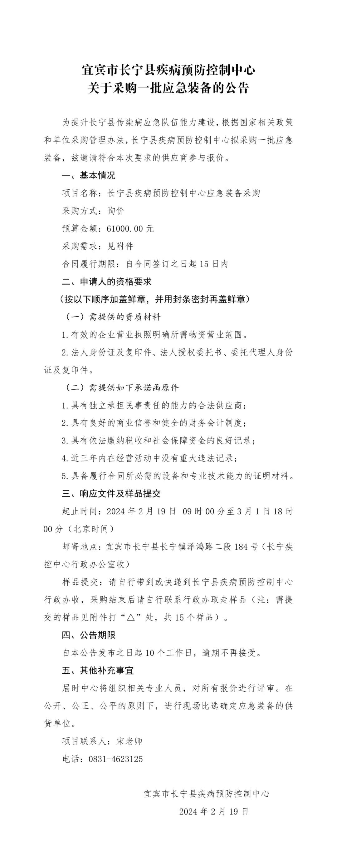 宜宾市长宁县疾病预防控制中心关于采购一批应急装备的公告