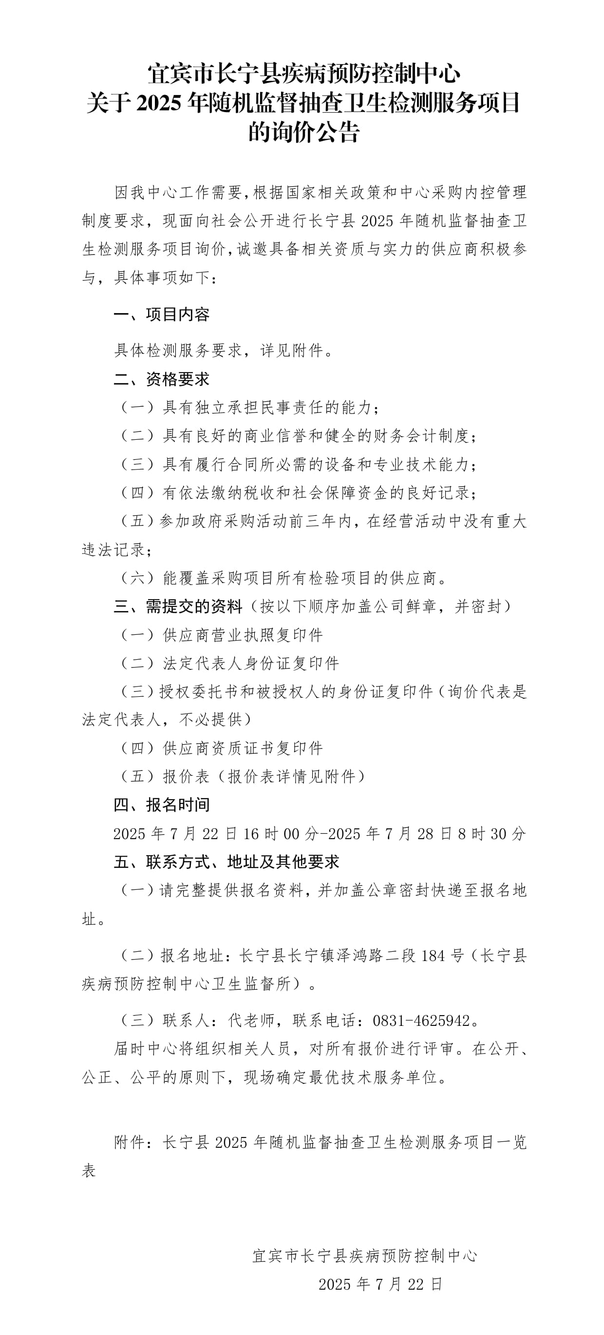 长宁县2025年随机监督抽查卫生检测服务项目一览表