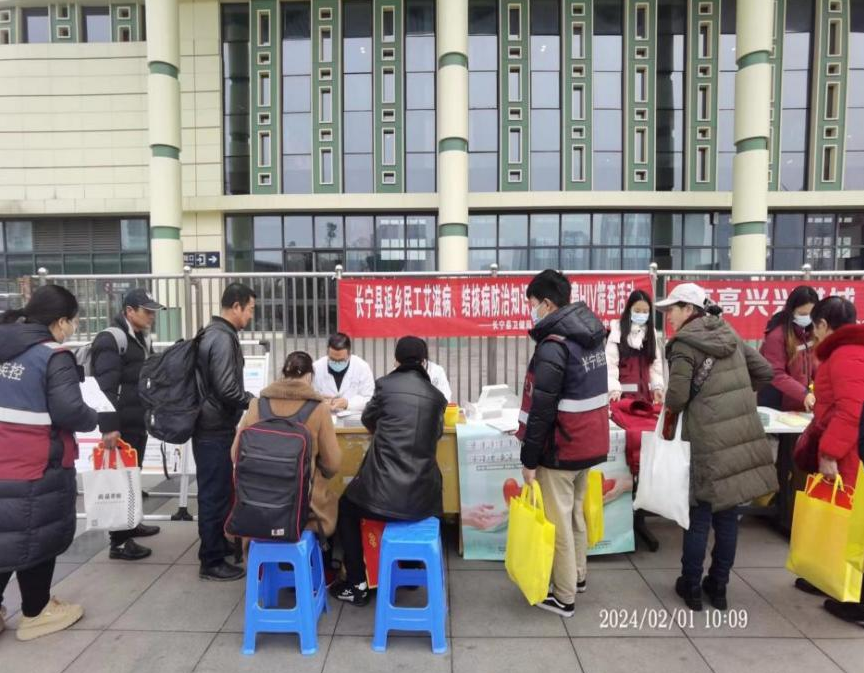 岁末年初,为提高我县返乡民工艾滋病、性病和丙肝防治知识知晓率,提供便民检测服务,2024年2月1日,县疾控中心联合长宁镇中心卫生院在高铁站开展艾滋病、性病和丙肝防治宣传检测活动。