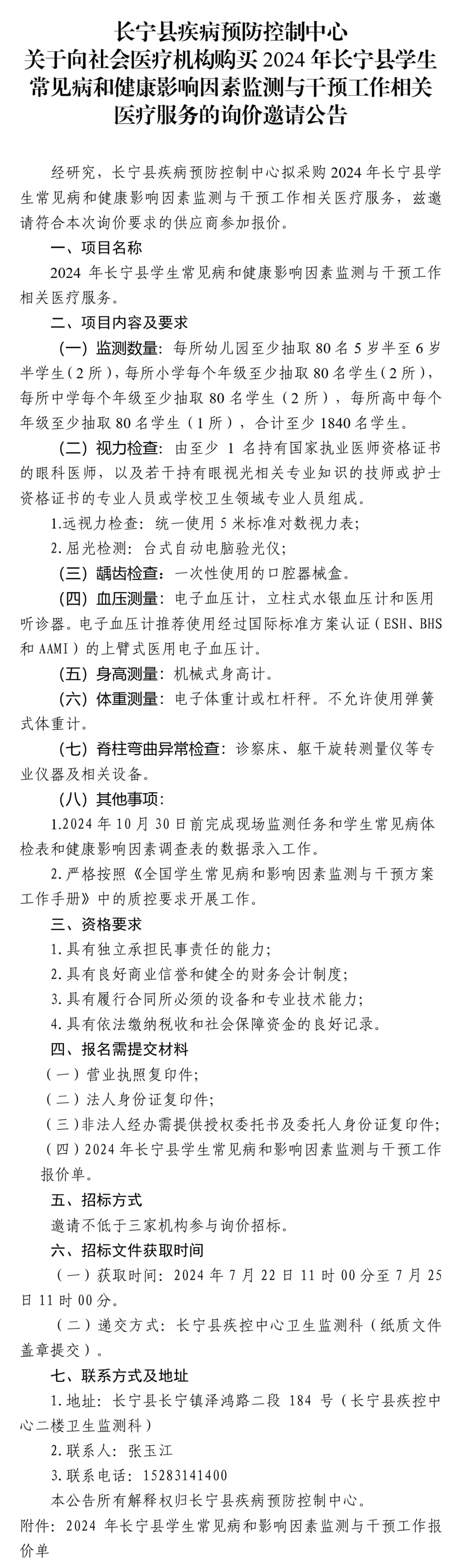 长宁县疾病预防控制中心关于向社会购买2024长宁县学生常见病和健康影响因素监测与干预工作的公告