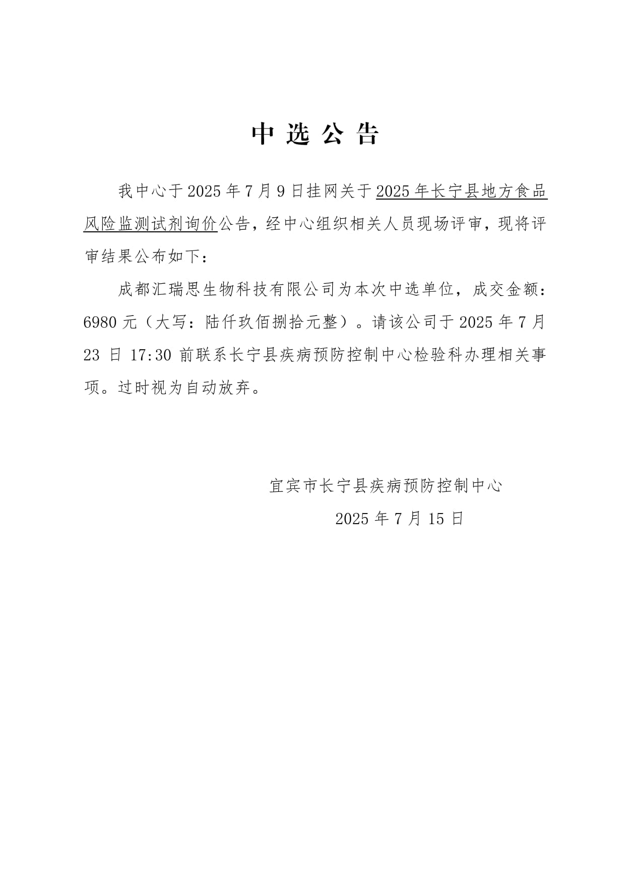 2025年长宁县地方食品风险监测试剂的询价公告