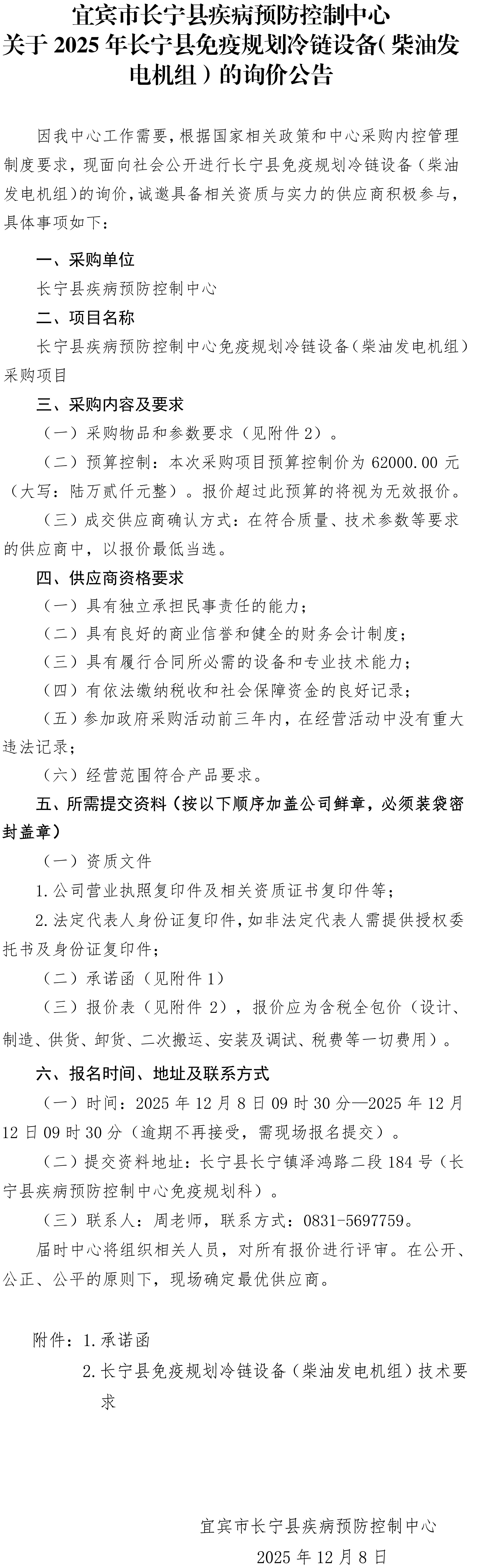 长宁县疾病预防控制中心关于2025年长宁县免疫规划冷链设备(柴油发电机组)的询价公告