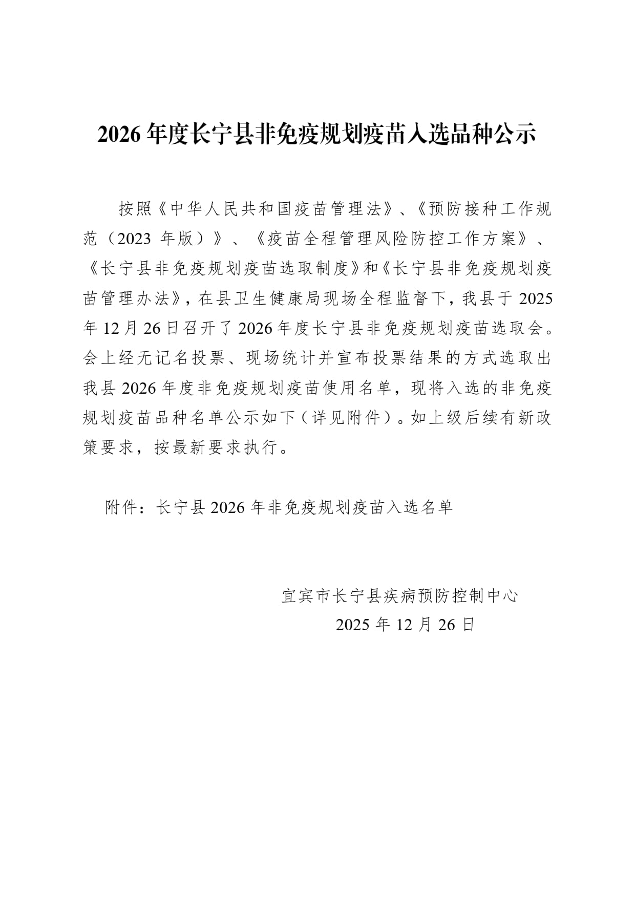 2026年度长宁县非免疫规划疫苗入选品种公示